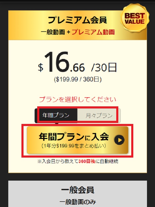 希望のプランを選んで申し込みボタンを押しましょう。プレミアム会員と一般会員、年間プランと月々プランをそれぞれ選択して進みます。