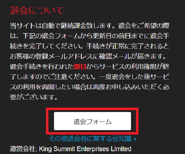 Hey動画月額見放題プランのサービスを停止したい場合は、「入会案内」の下の方から退会フォームに進めます。その後は簡単なアンケートに答え、退会を確定させると完了メールが届きます。