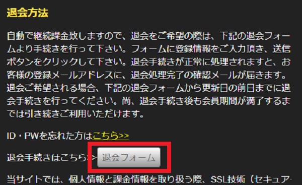 レズのしんぴのサービスを停止したい場合は、「入会案内」の下の方から退会フォームに進めます。その後は簡単なアンケートに答え、退会を確定させると完了メールが届きます。