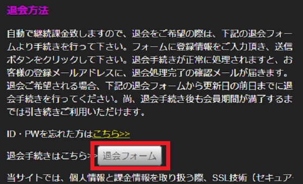 女体のしんぴのサービスを停止したい場合は、「入会案内」の下の方から退会フォームに進めます。その後は簡単なアンケートに答え、退会を確定させると完了メールが届きます。