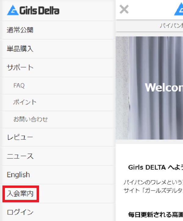 ここではスマホから操作した場合の入会方法を載せておきます。左上のメニューを選択すると「入会案内」と表示されているので進みます。パソコンからでも手順は変わりません。