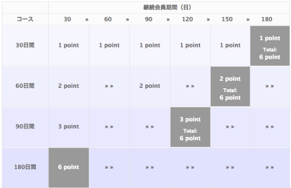 上の表のように、30日間経過するごとに1ポイントずつ貯まり、各契約更新日ごとにポイントが加算されていきます。