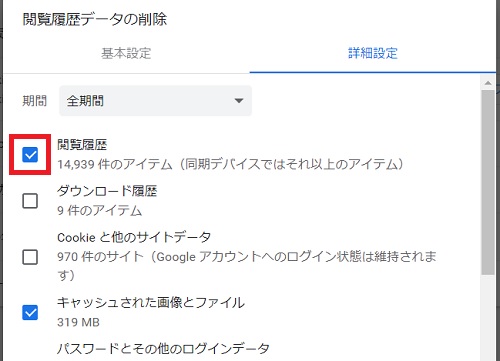 3.「閲覧履歴」にチェックを入れてデータの削除ボタンを押すと、設定した期間分の履歴が削除されます。